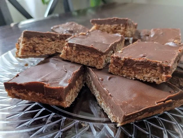 - Assemble the Bars: Once the oat base is baked, spread the chocolate-peanut butter mixture evenly over the top.